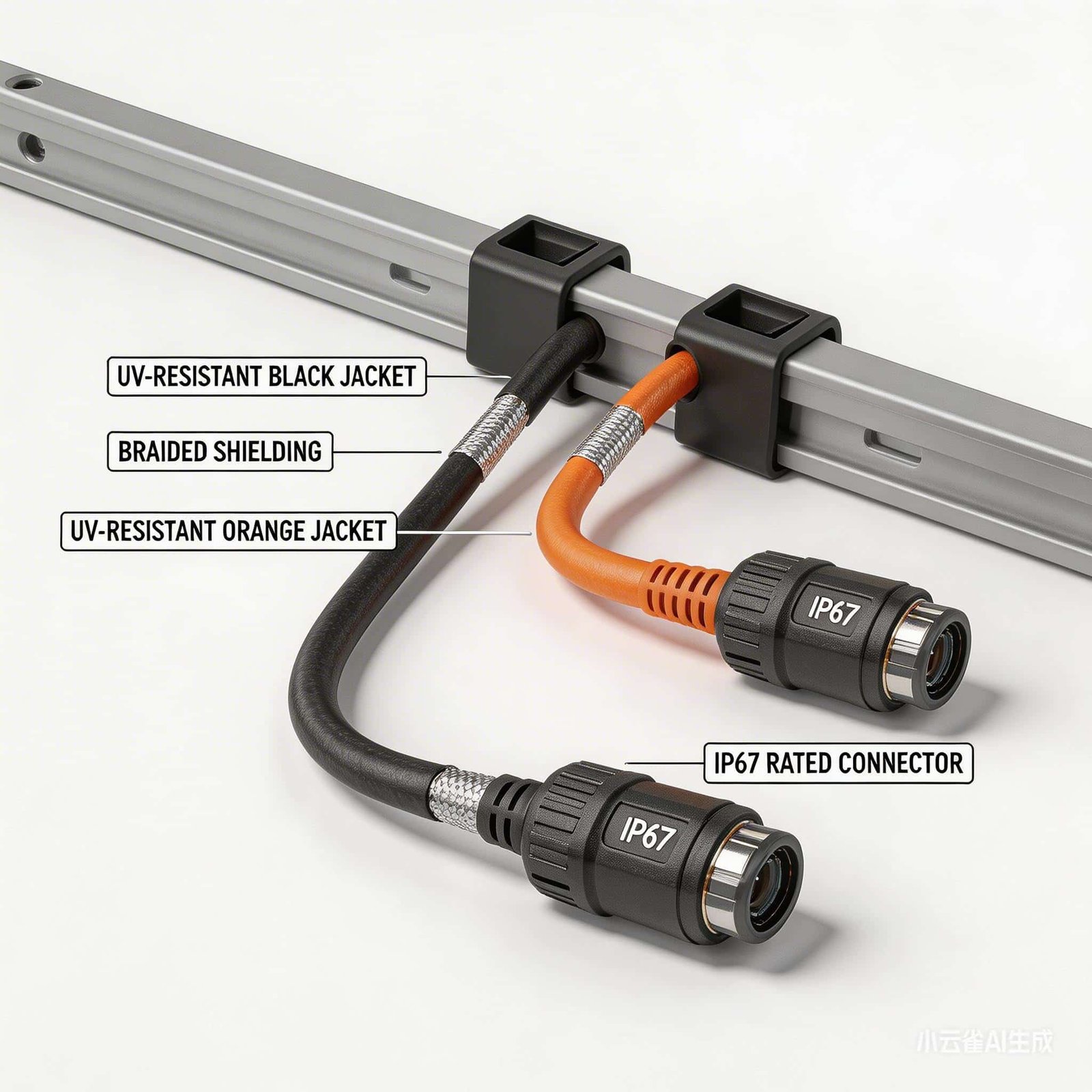 Weather-resistant UV wiring for outdoor renewables and BMS storage.